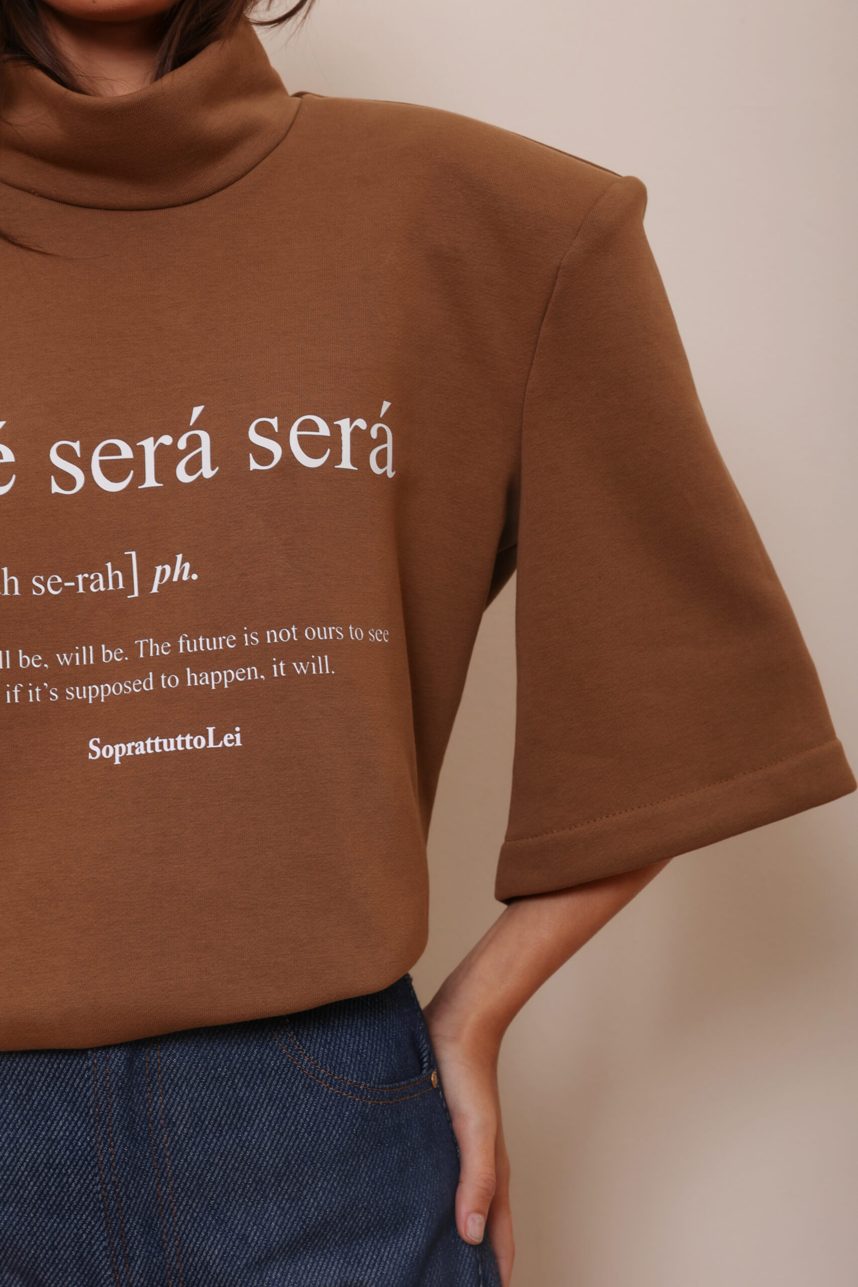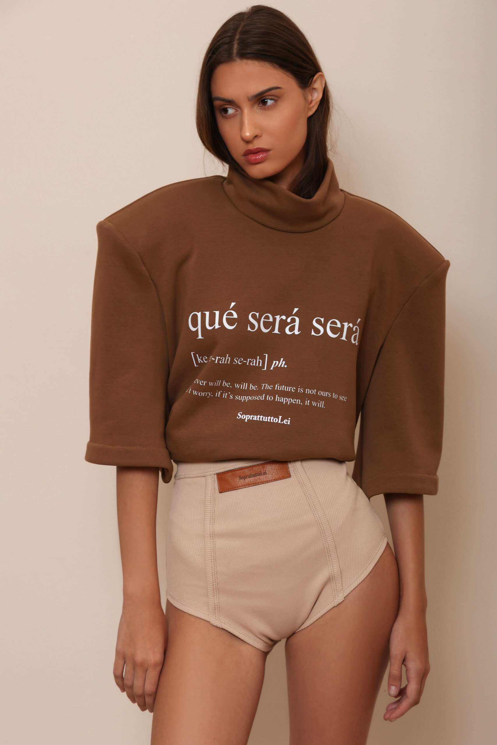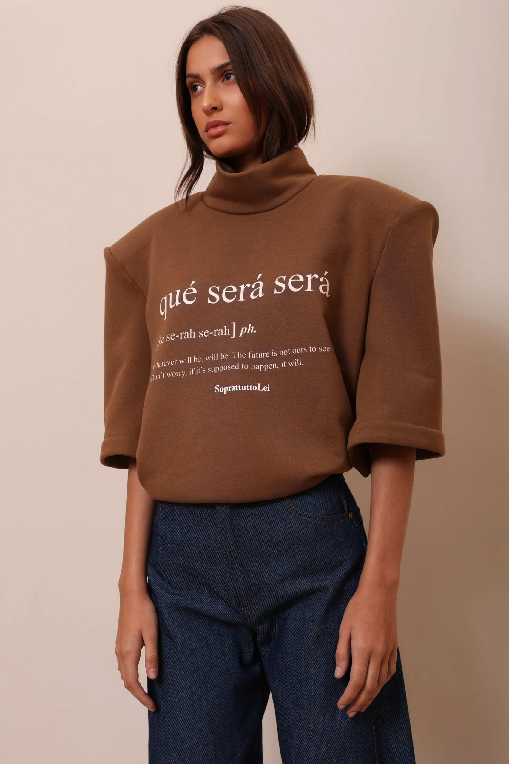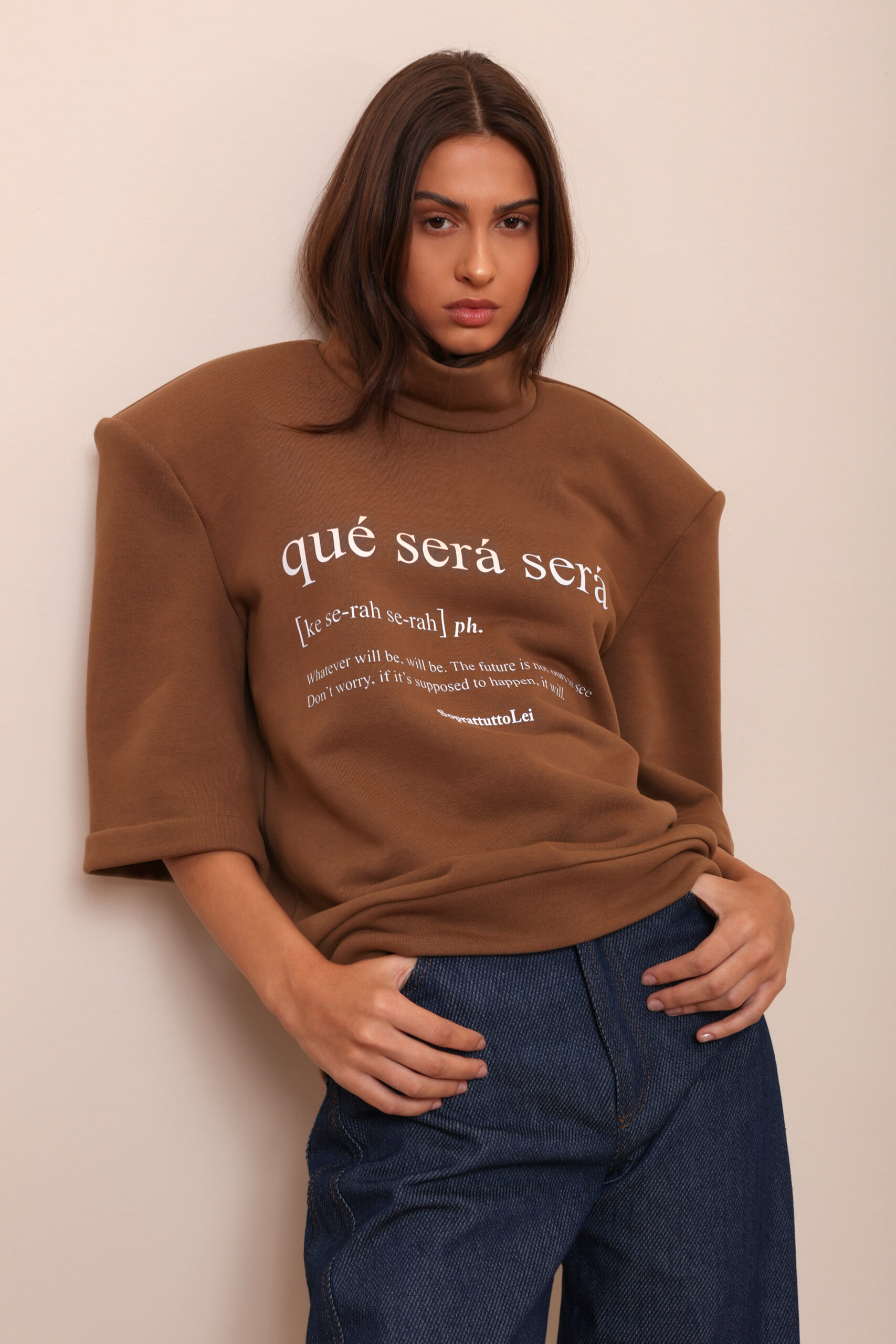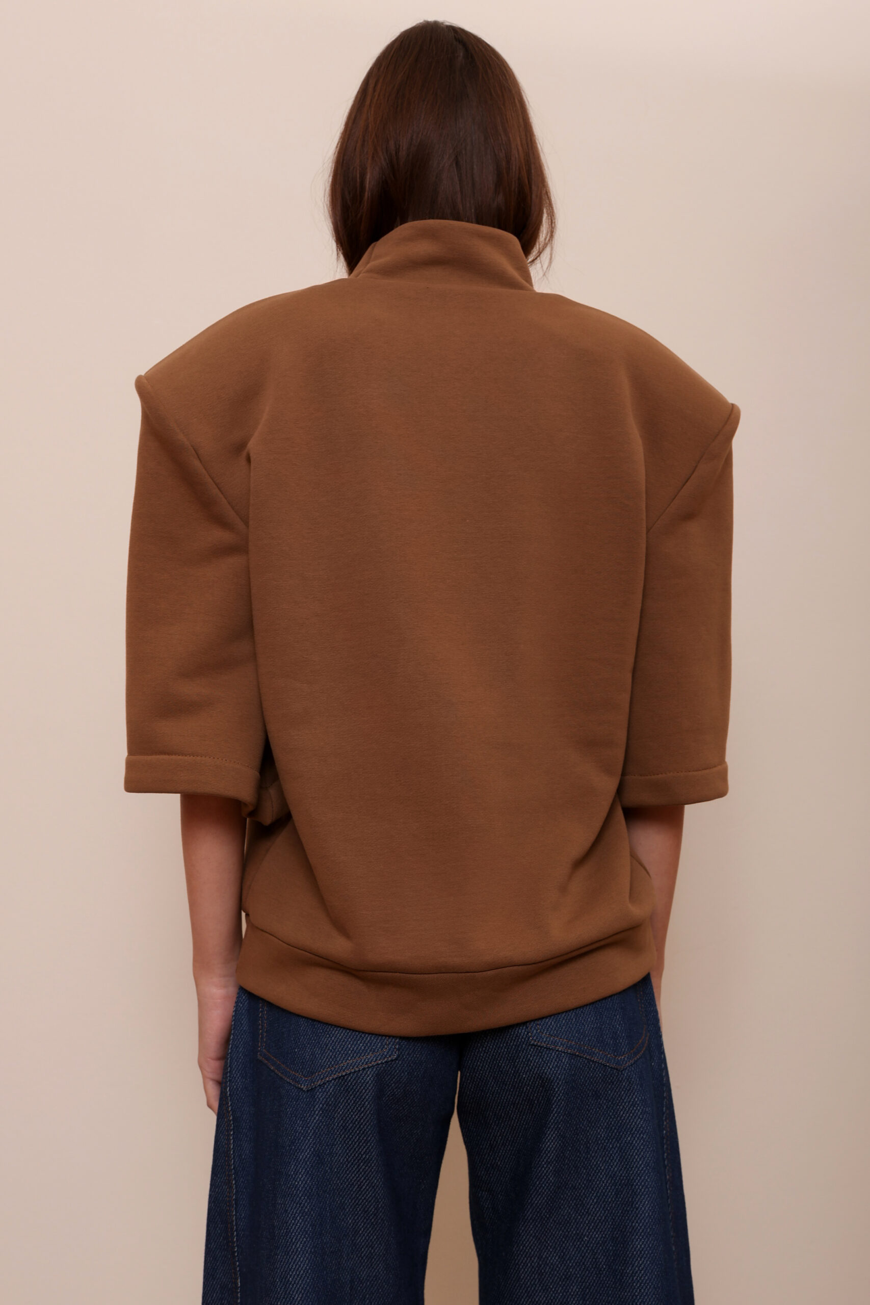 THIS OVERSIZED SWEATSHIRT IS MADE FROM 100% PREMIUM COTTON IN A RICH COCOA-BROWN SHADE. FEATURING A HIGH-STRUCTURED TURTLENECK AND ELBOW SLEEVES, IT BALANCES CASUAL COMFORT WITH SCULPTURAL SHAPE.