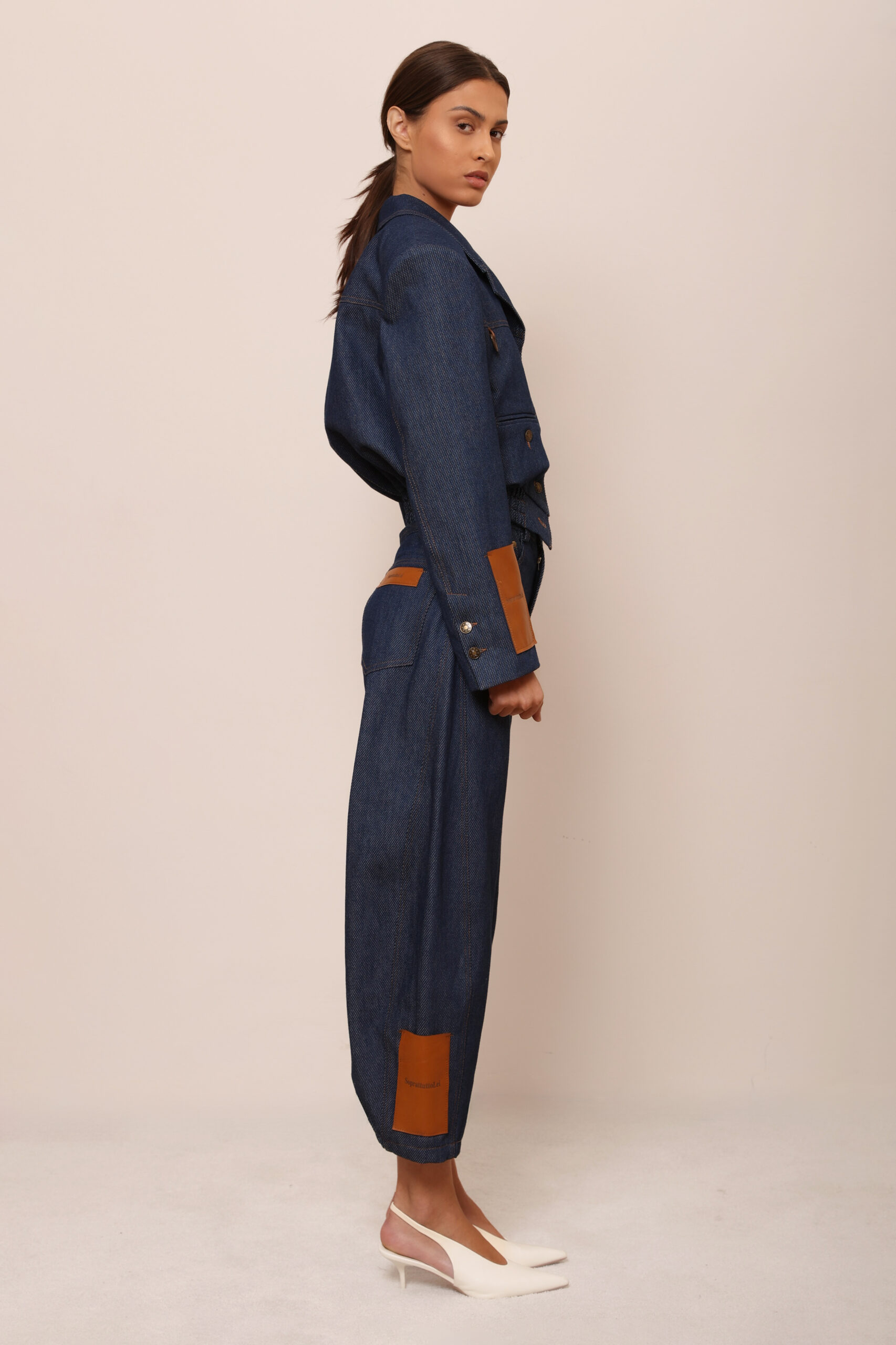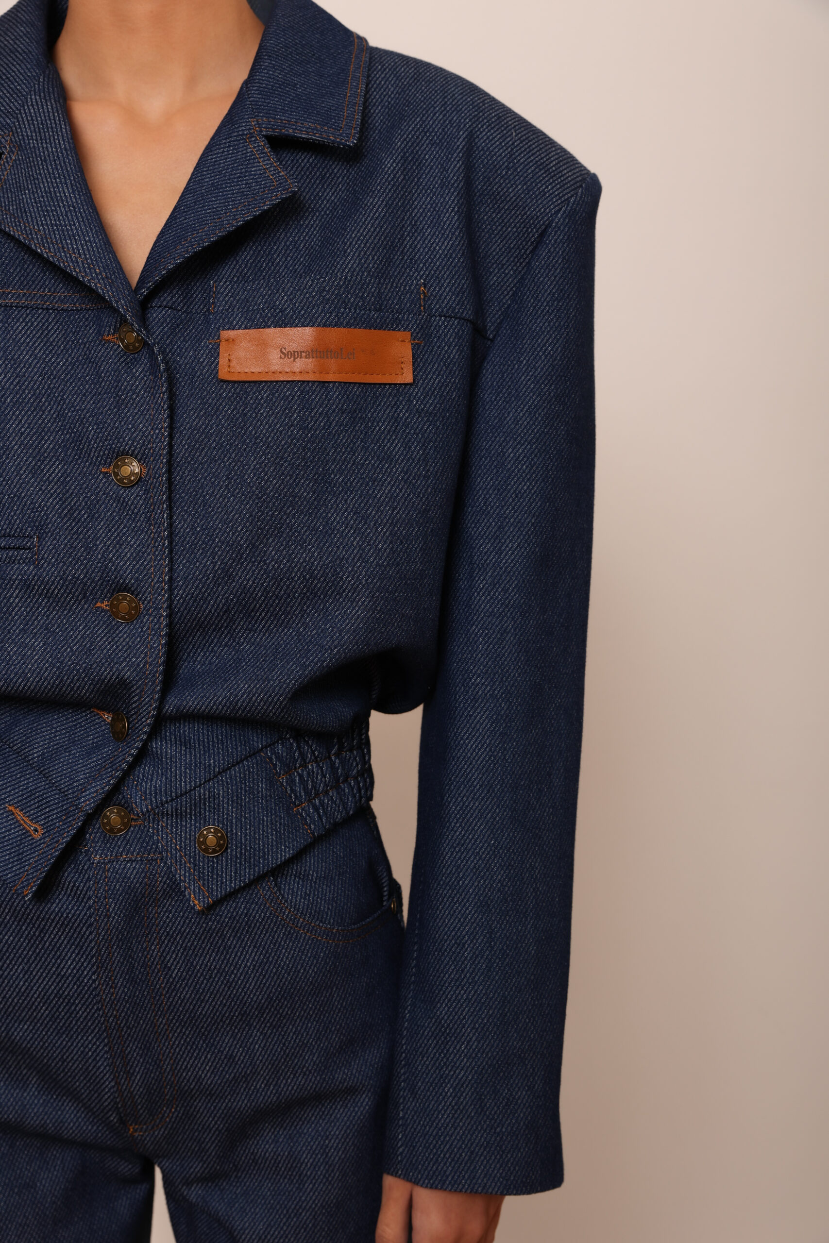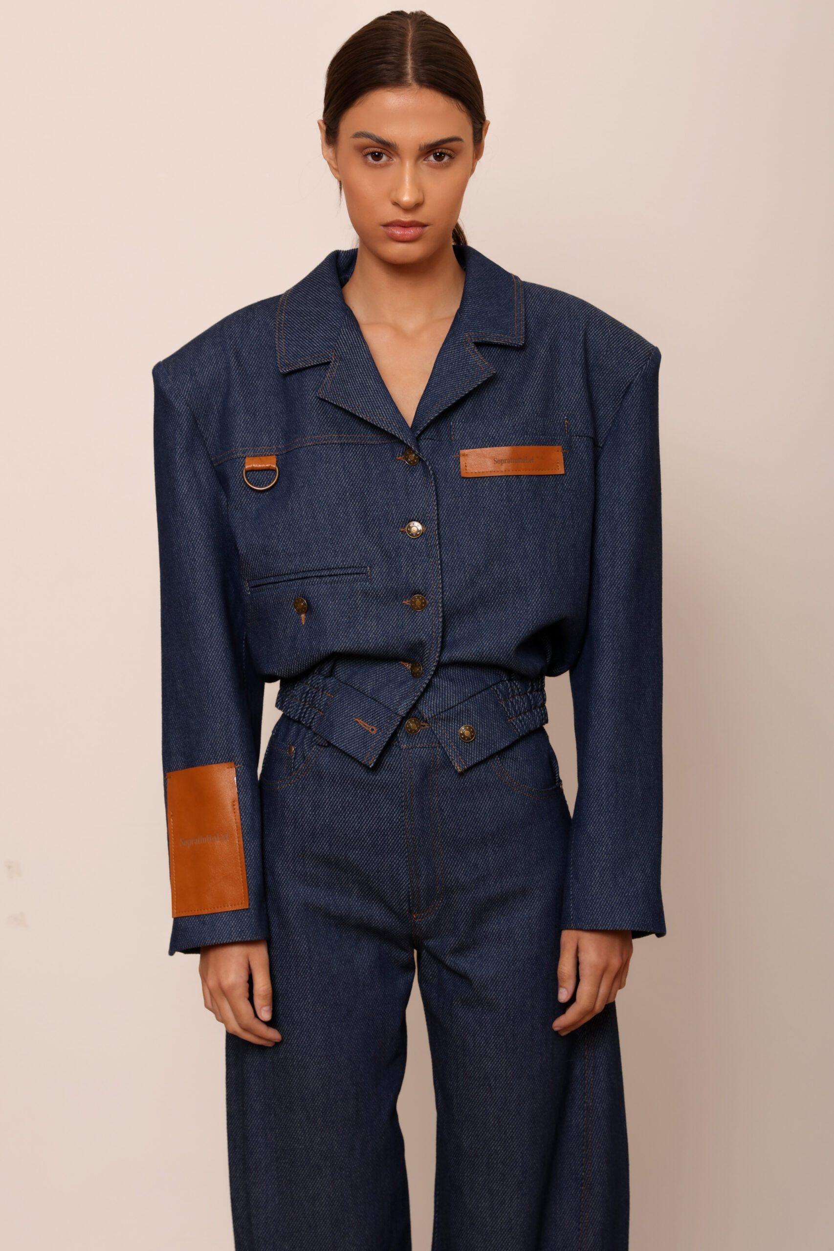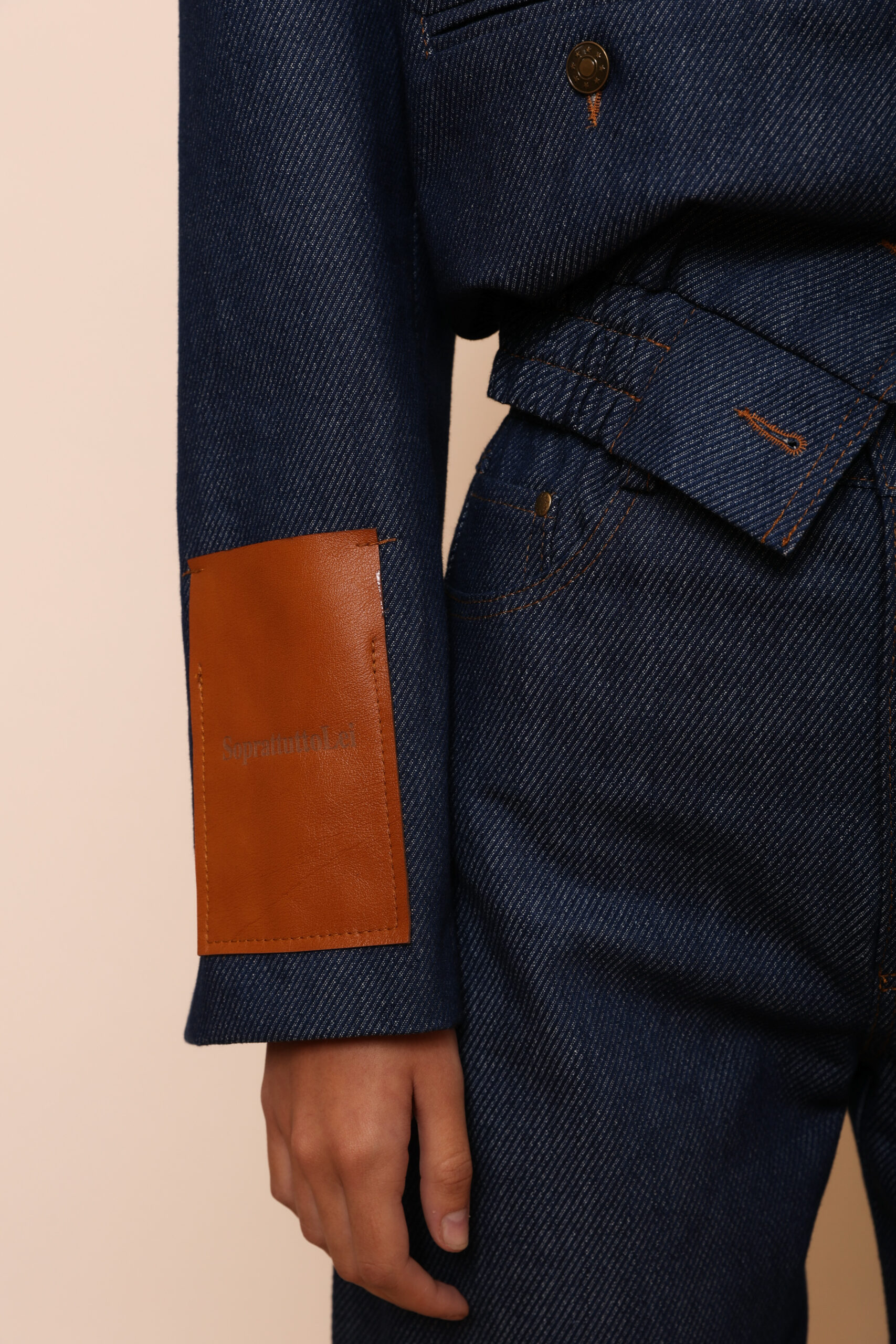 THE SCULPTED JACKET FEATURES SHARP SHOULDERS, AN ACCENTED COLLAR, AND CONTRASTING LEATHER DETAILS EMBOSSED WITH THE SOPRATTUTTOLEI SIGNATURE; A NOD TO TAILORED PRECISION AND LUXURY FUNCTIONALITY.