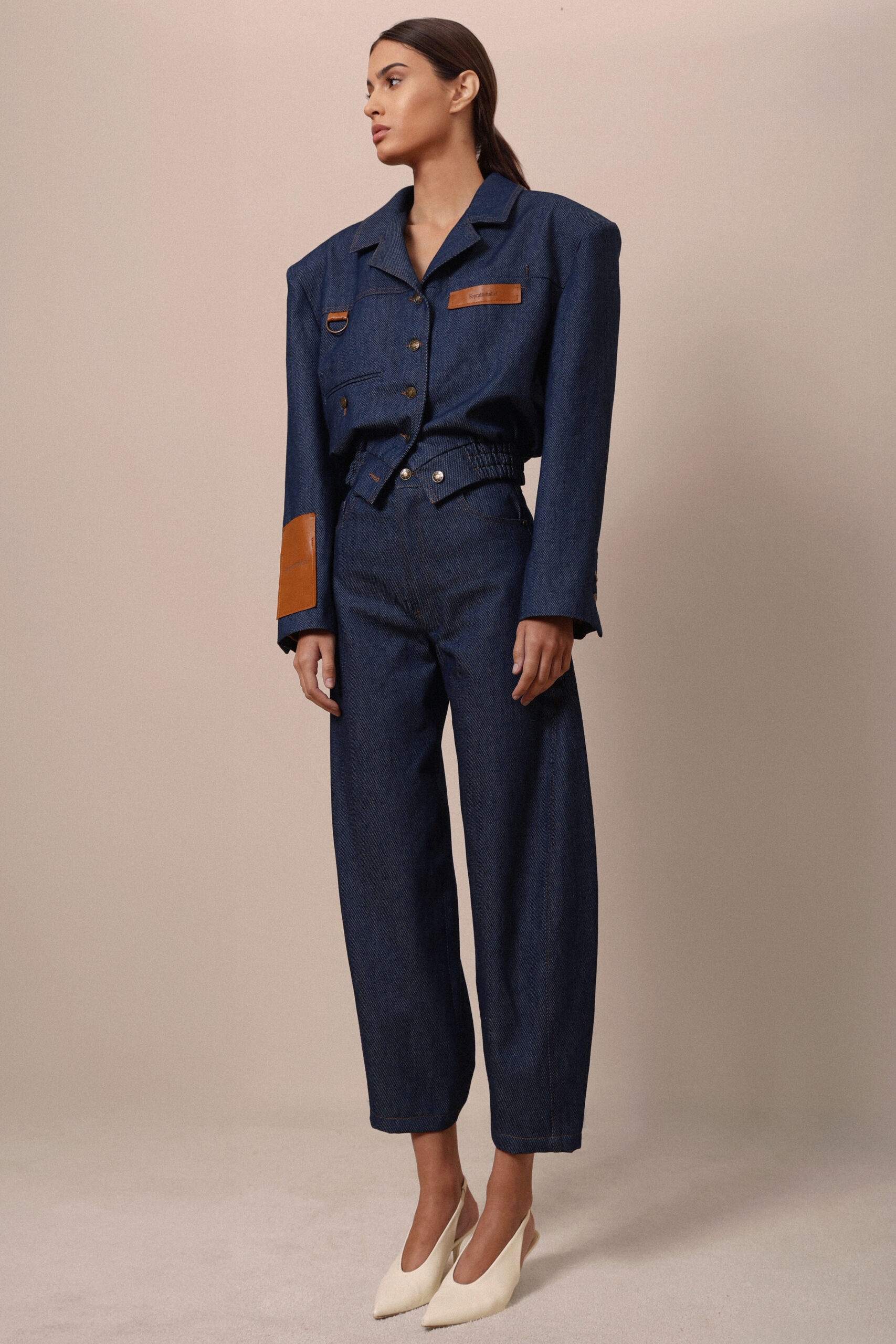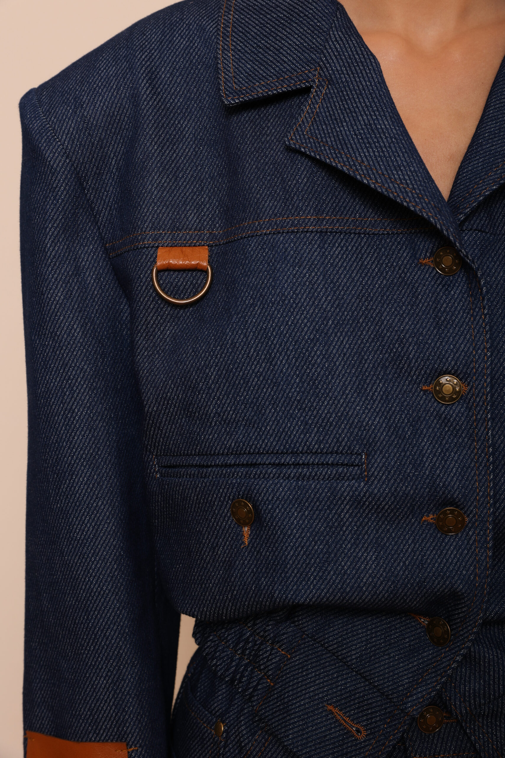 THIS DENIM JACKET IS CUT FROM PREMIUM RAW COTTON DENIM IN DEEP INDIGO AND DETAILED WITH CONTRASTING CARAMEL LEATHER PATCHES AND METAL HARDWARE. THE SCULPTED SHOULDERS AND SHARP COLLAR CREATE AN ASSERTIVE, ARCHITECTURAL SHAPE, WHILE THE CINCHED WAIST BRINGS BALANCE AND FEMININITY. FUNCTIONAL FRONT POCKETS AND DISTINCTIVE BUTTON PLACEMENT ENHANCE THE DESIGN’S MODULAR AESTHETIC, MAKING IT BOTH PRACTICAL AND STATEMENT-WORTHY. A MODERN INTERPRETATION OF THE CLASSIC WORKWEAR JACKET. STRONG, TAILORED, AND REFINED.