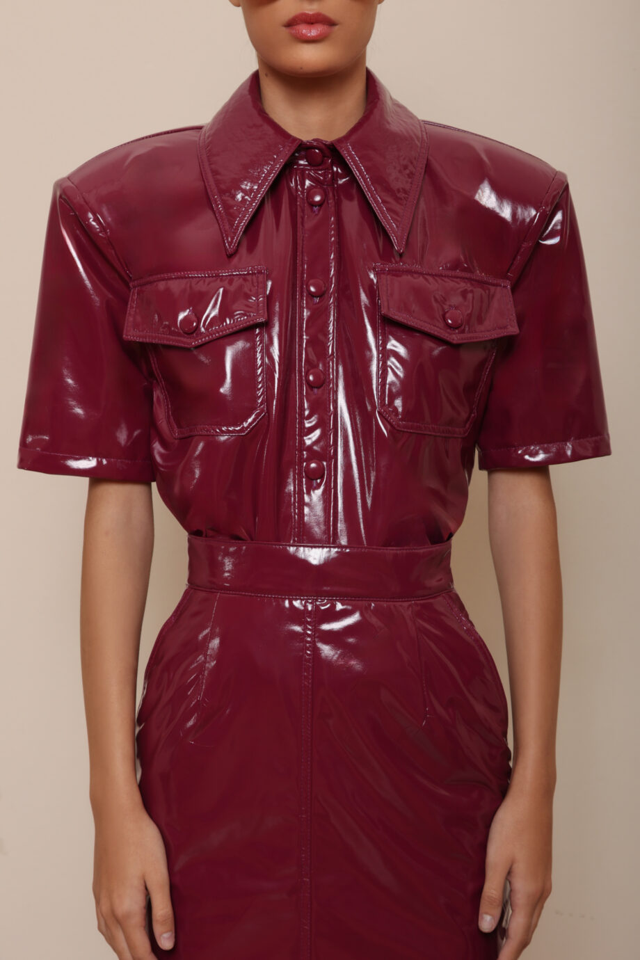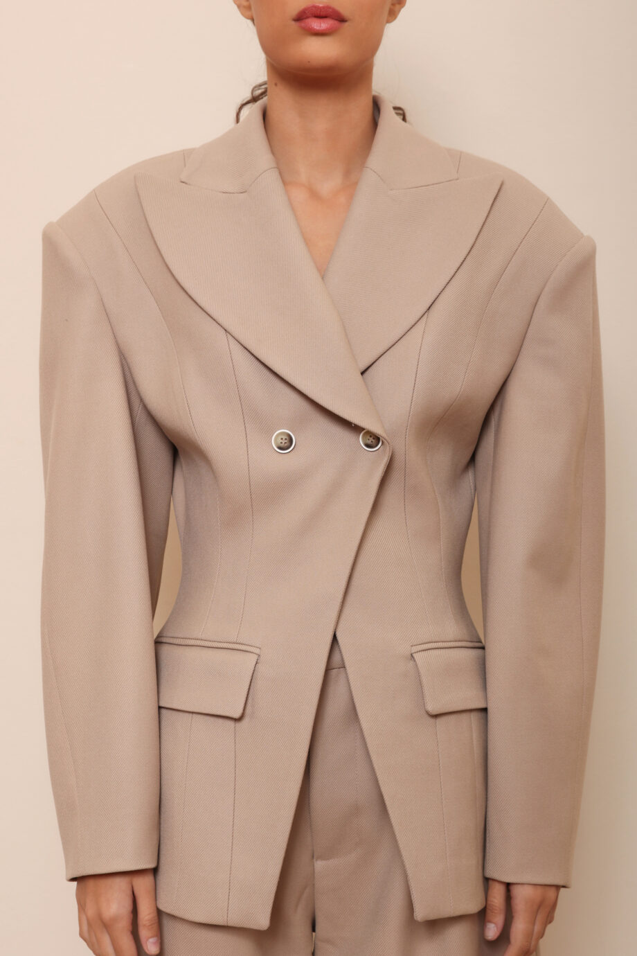 THE DESIGN FEATURES A SINGLE-BREASTED FRONT WITH A LINE OF CONTRAST BUTTONS, SHARP LAPELS, AND SCULPTED SHOULDERS THAT ENHANCE THE FEMININE SILHOUETTE.