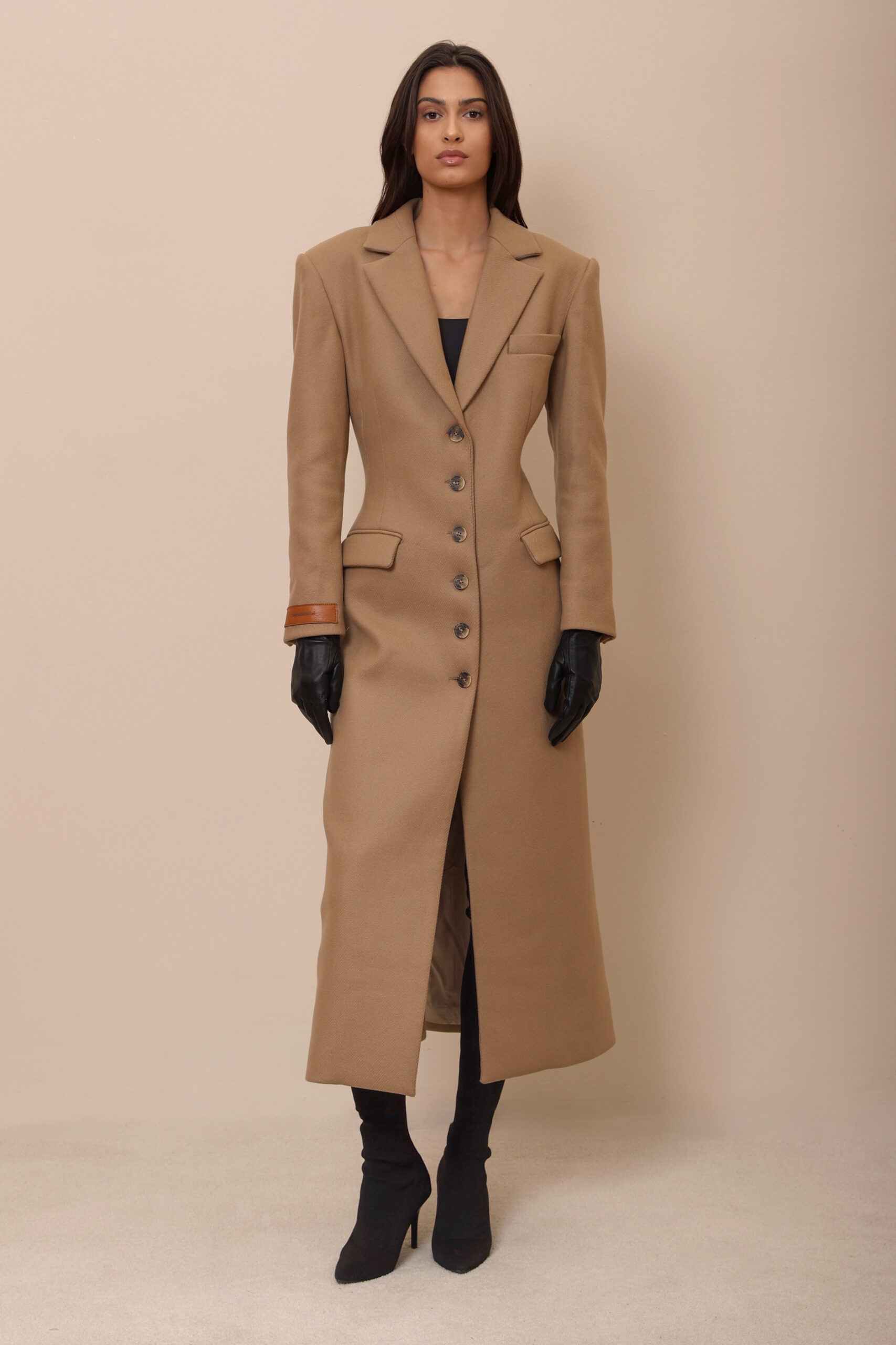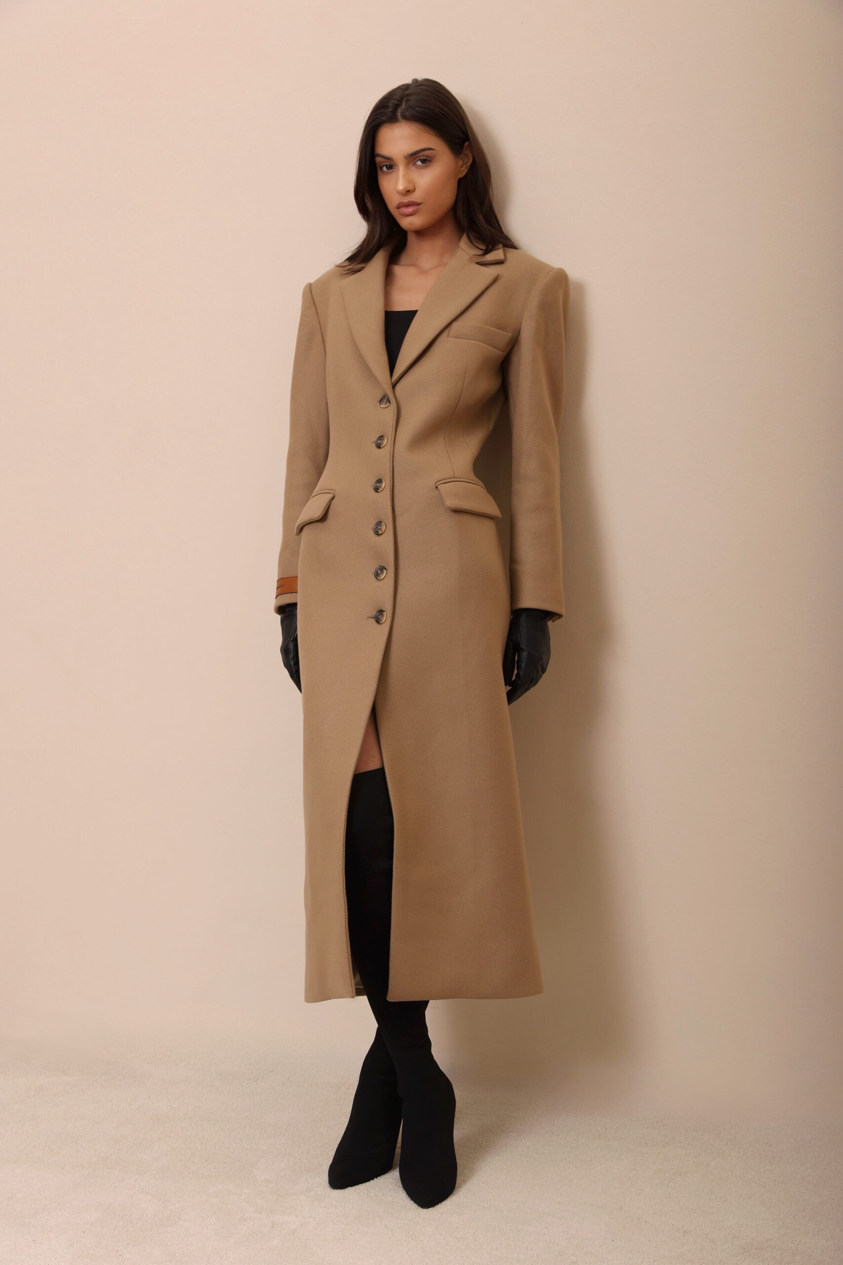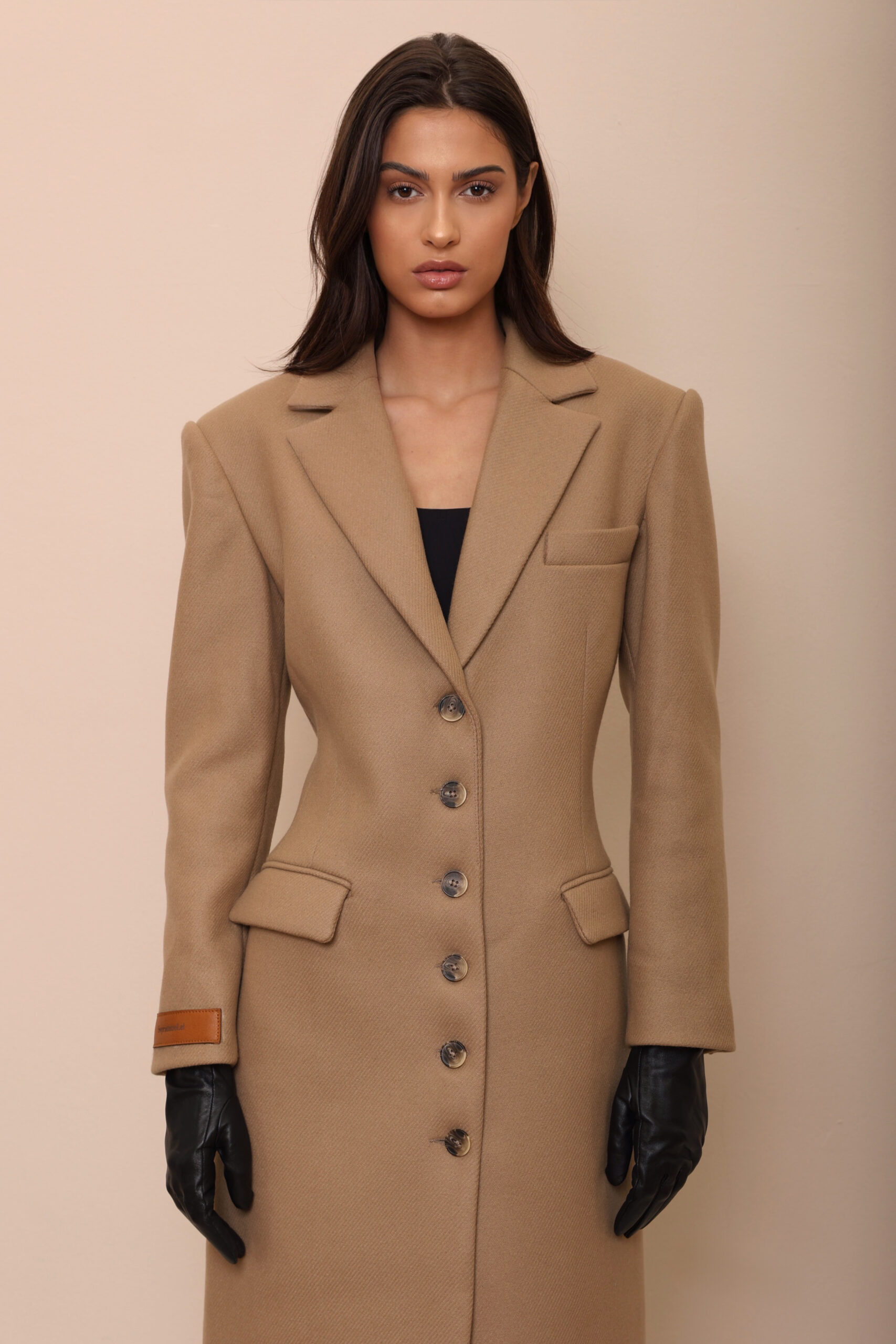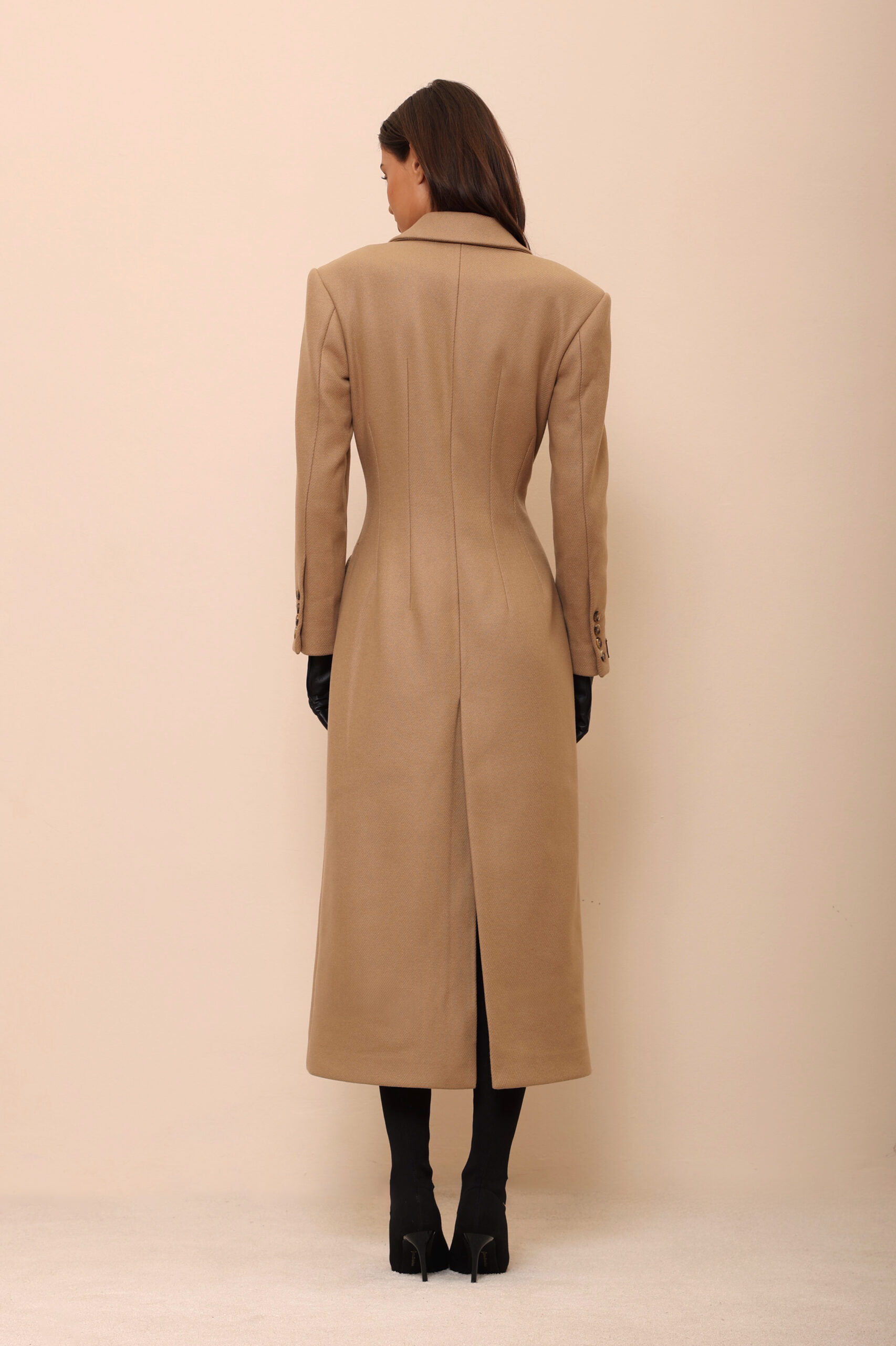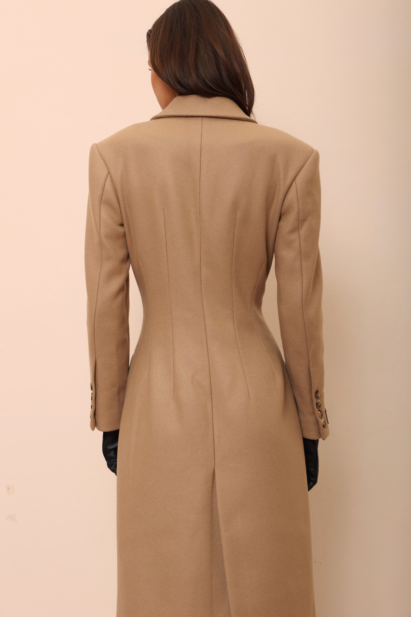 THIS LONG COAT IS EXPERTLY TAILORED FROM A PREMIUM FABRIC BLEND OF 85% WOOL AND 15% POLYAMIDE, OFFERING BOTH WARMTH AND REFINED STRUCTURE.