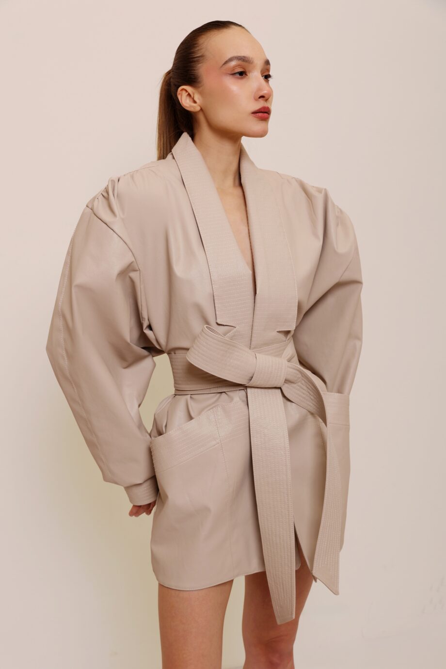 THIS STATEMENT JACKET IS CRAFTED FROM HIGH-GLOSS VEGAN LEATHER IN DEEP NAVY BLUE, FEATURING SCULPTED BALLOON SLEEVES AND A TAILORED, CINCHED WAIST. THE GEOMETRIC PANELING AND SIGNATURE BACK DETAIL CREATE A STRIKING ARCHITECTURAL FORM THAT REDEFINES POWER DRESSING. THE SUBTLE SHINE OF THE VEGAN LEATHER ADDS DEPTH, WHILE THE EXAGGERATED VOLUME AND PRECISE CUTTING BRING A SCULPTURAL, CONTEMPORARY EDGE.