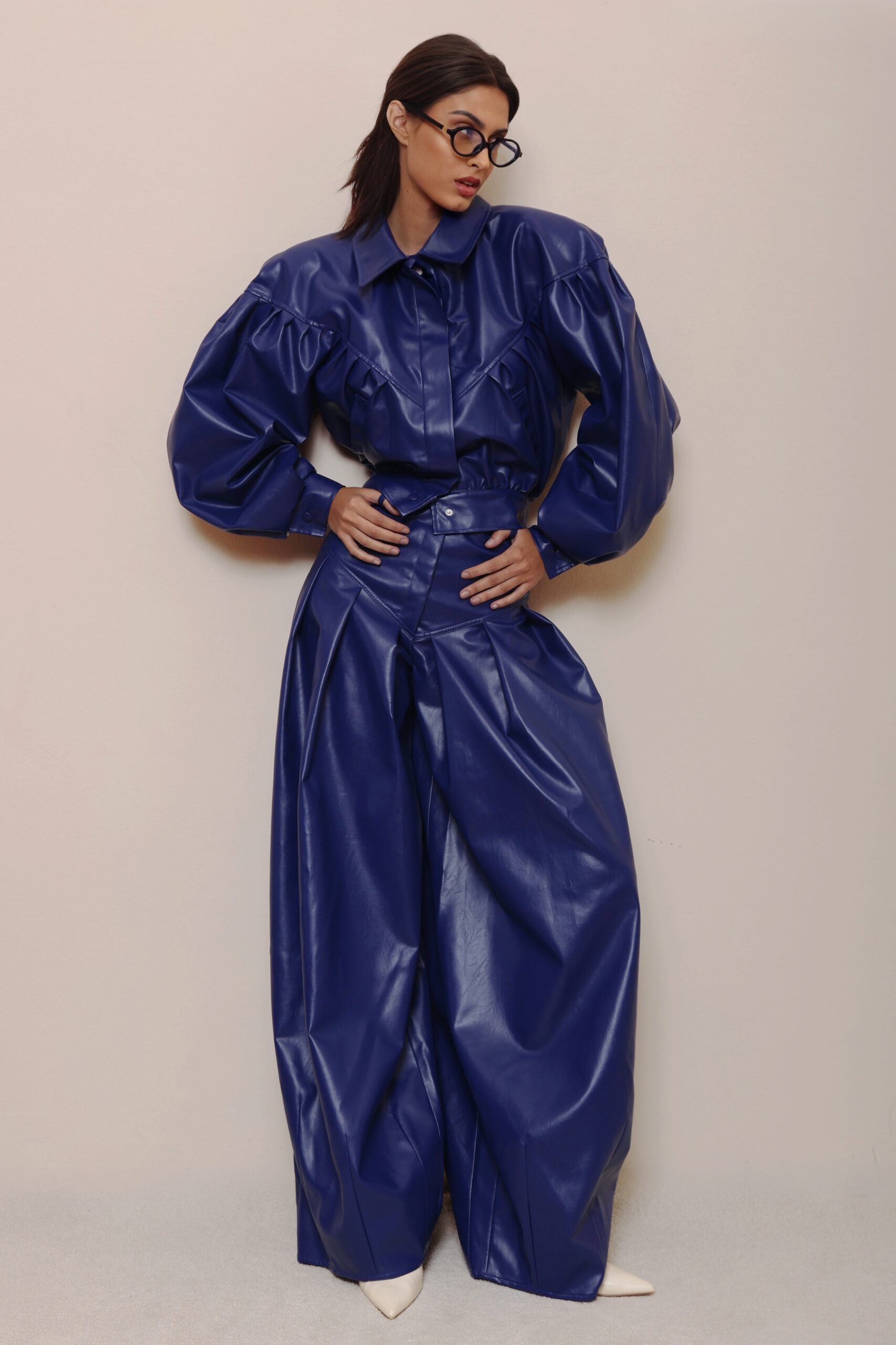 SCULPTURAL FORM MEETS CONFIDENCE. THIS ROYAL BLUE SET IS CRAFTED FROM LUXURIOUS VEGAN LEATHER. THE JACKET FEATURES DRAMATIC, VOLUMINOUS SLEEVES AND A CONTOURED CUT THAT CREATES A SCULPTED SILHOUETTE, BALANCING STRUCTURE AND FLUIDITY.