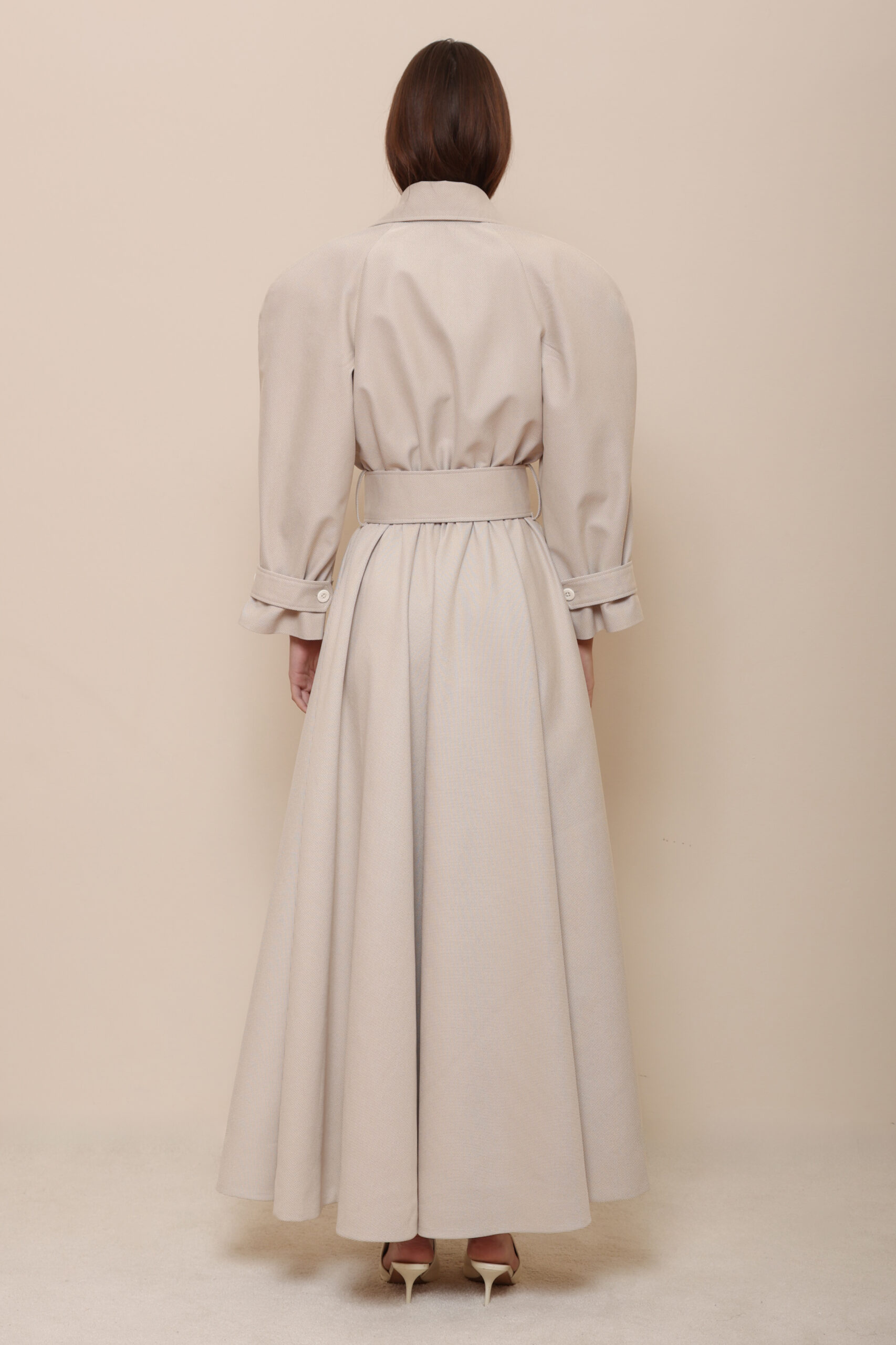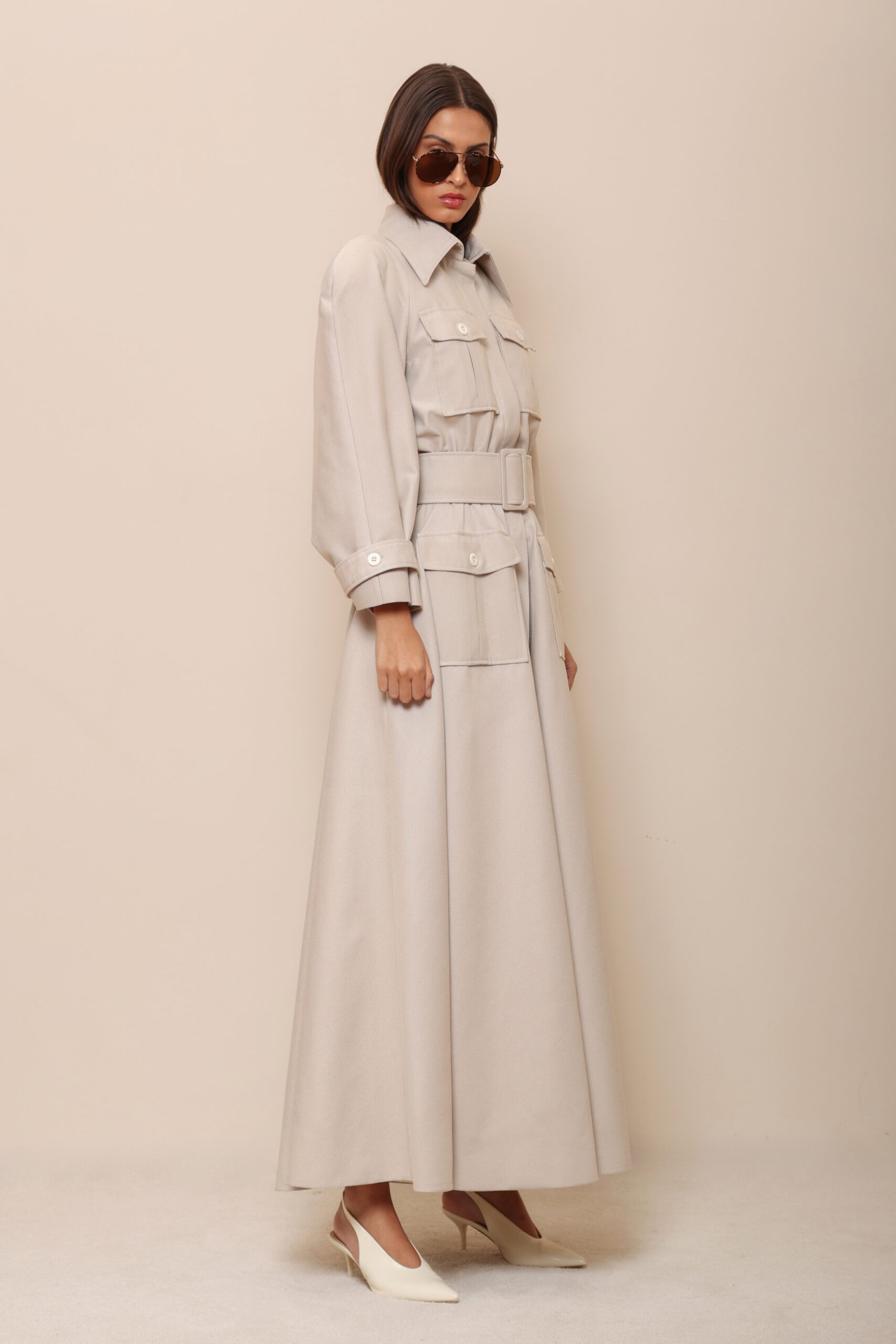 CRAFTED FROM A REFINED WOOL-VISCOSE BLEND WITH A SUBTLE TEXTURED FINISH, THIS MAXI TRENCH-DRESS MERGES THE STRUCTURE OF OUTERWEAR WITH THE FLUIDITY OF HIGH-END TAILORING.