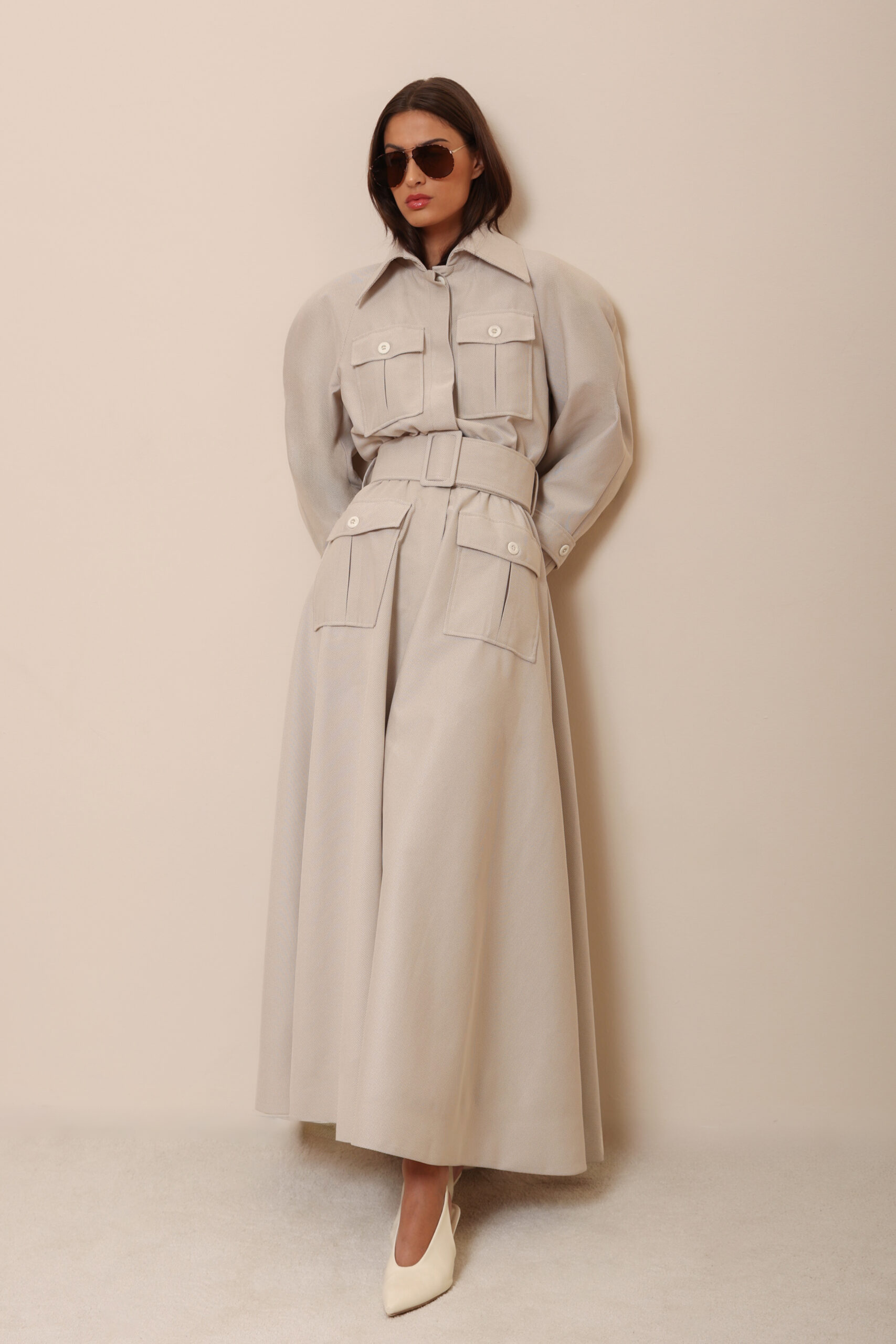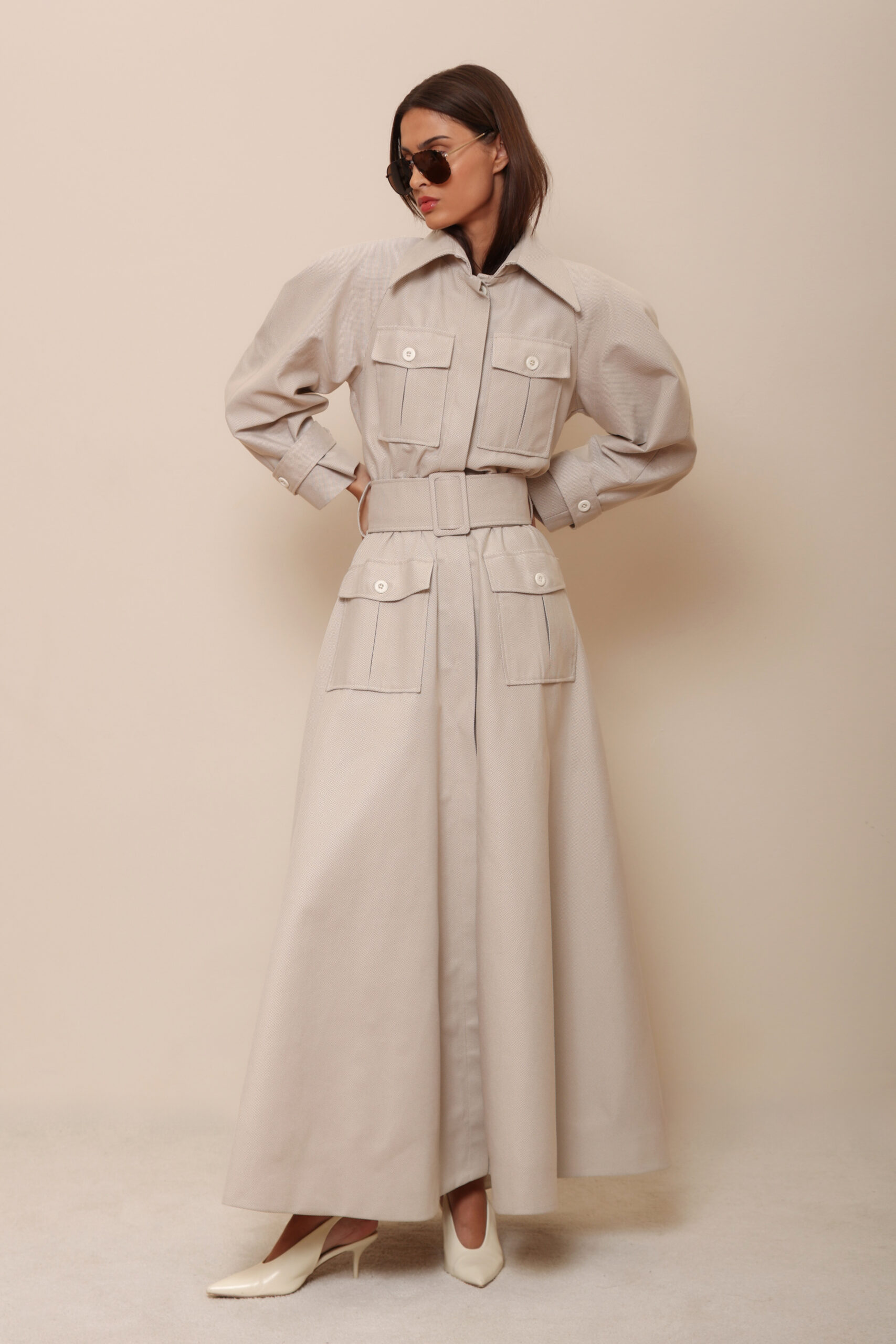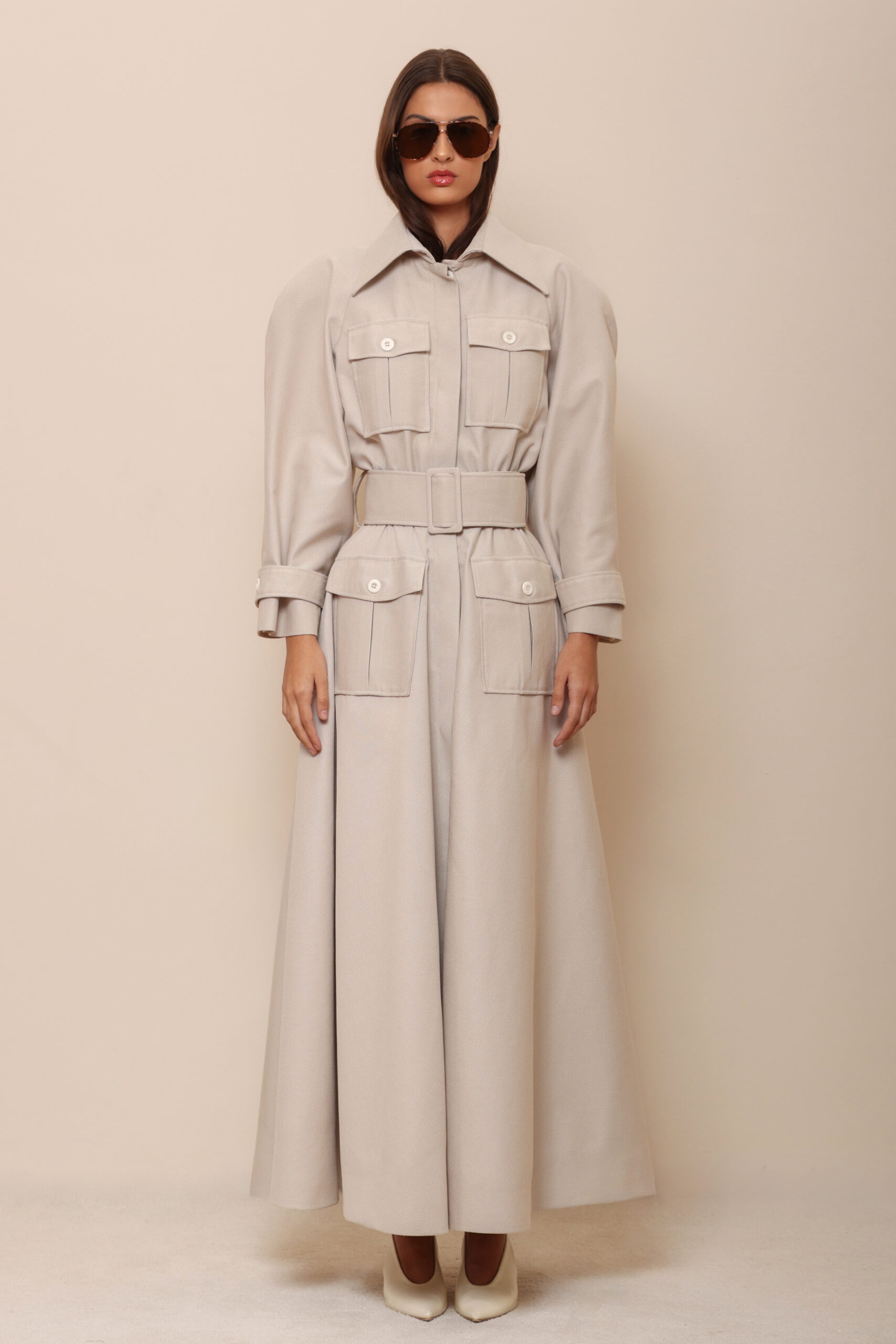 THE DESIGN FEATURES AN EMPHASIZED SHOULDER LINE, FOUR FRONT POCKETS, AND A WIDE BELT THAT ACCENTUATES THE WAIST, CREATING A STATEMENT YET UNDERSTATED LOOK.