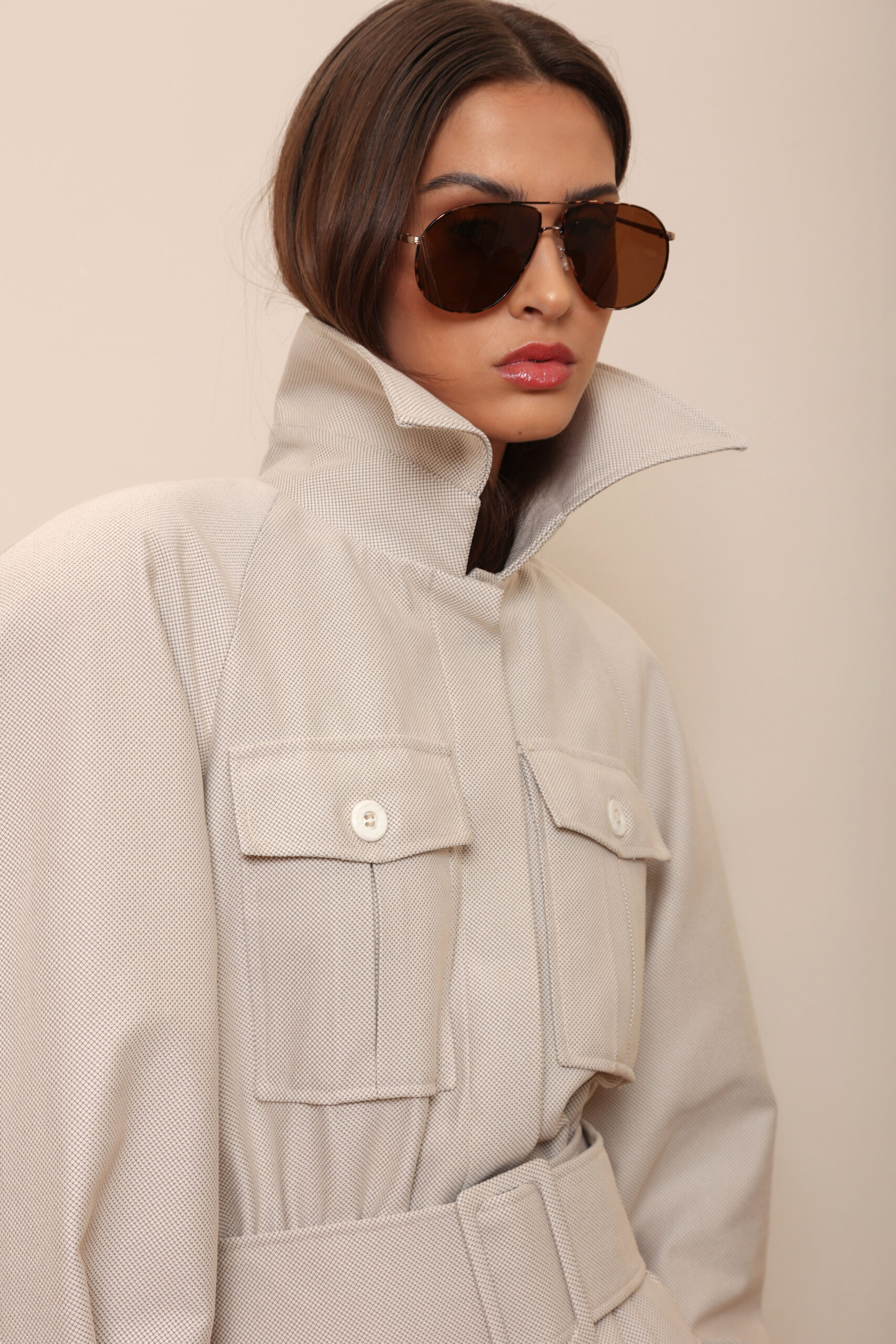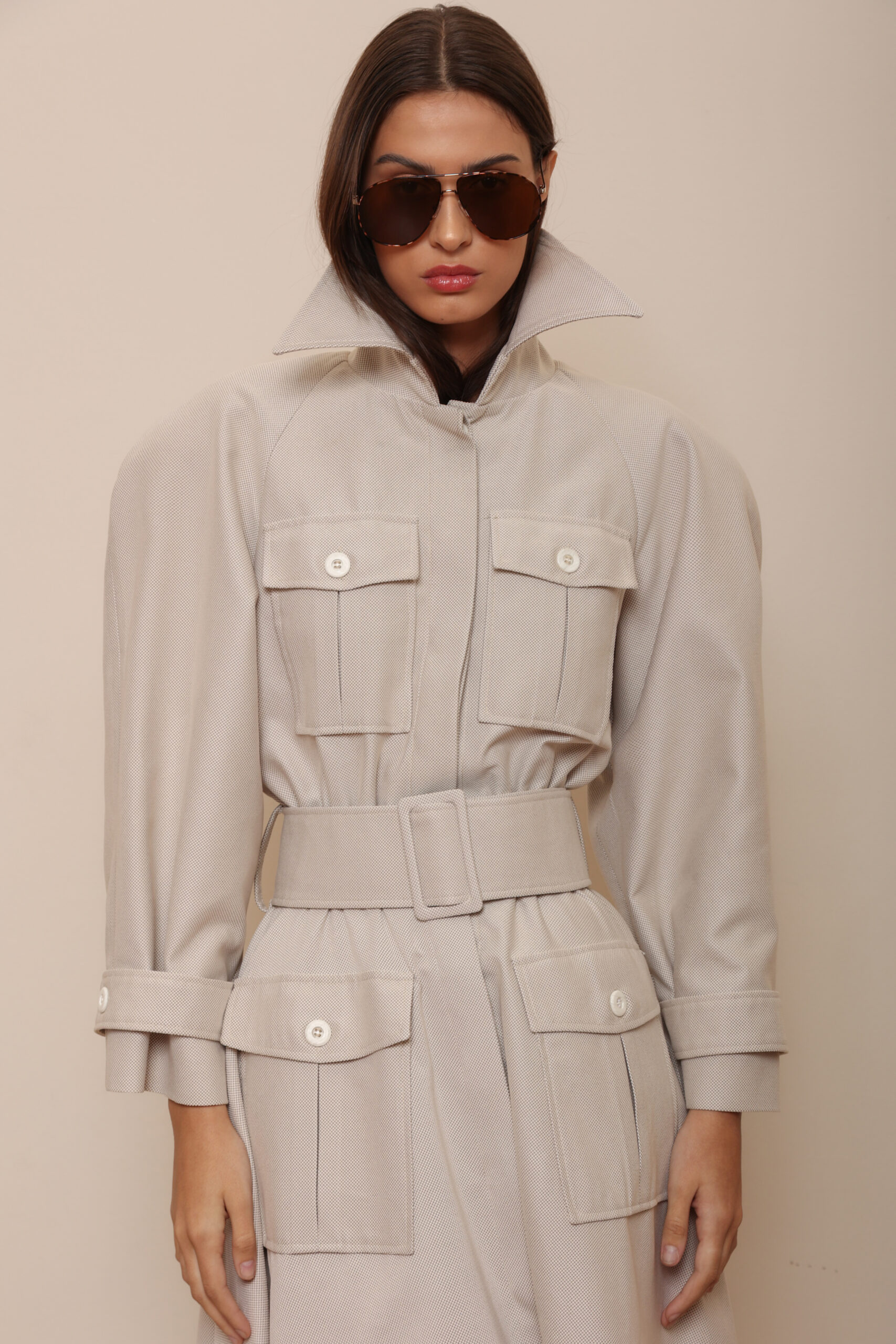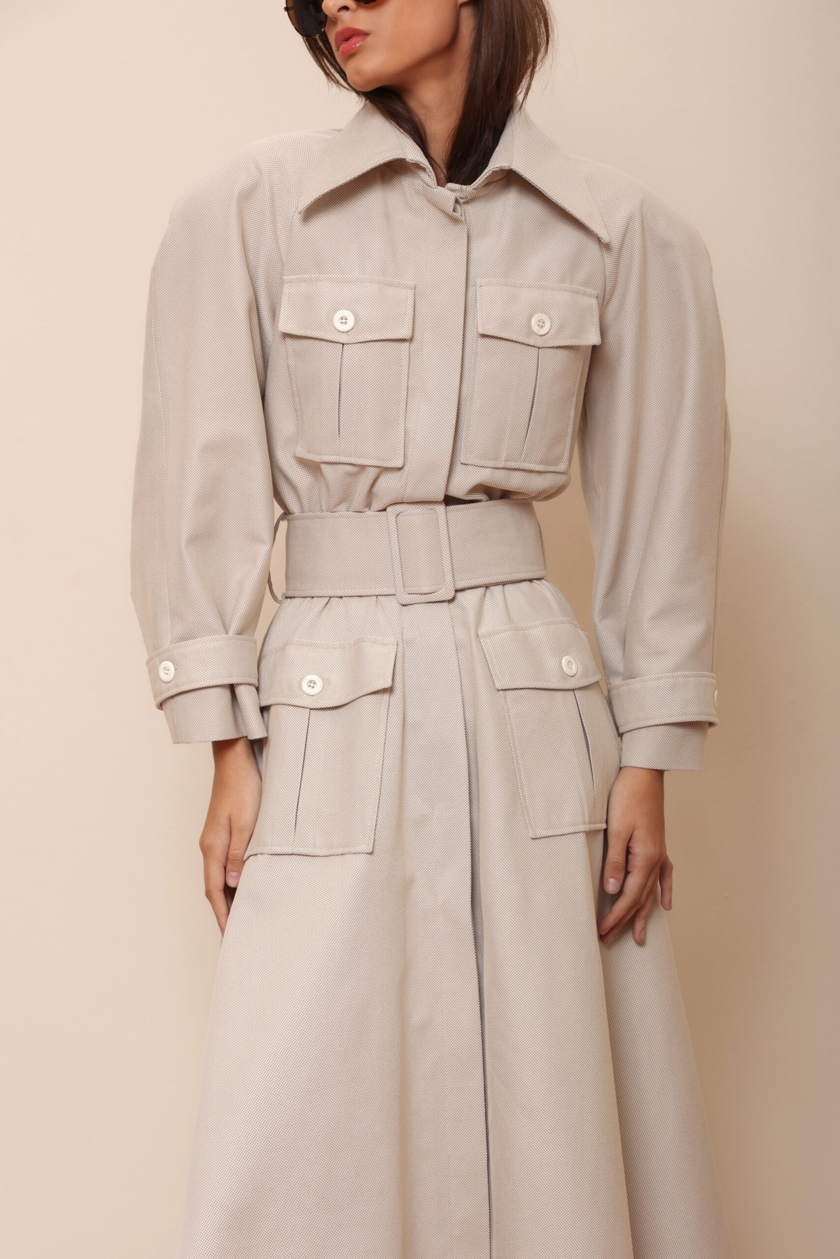 THE DESIGN FEATURES AN EMPHASIZED SHOULDER LINE, FOUR FRONT POCKETS, AND A WIDE BELT THAT ACCENTUATES THE WAIST, CREATING A STATEMENT YET UNDERSTATED LOOK.