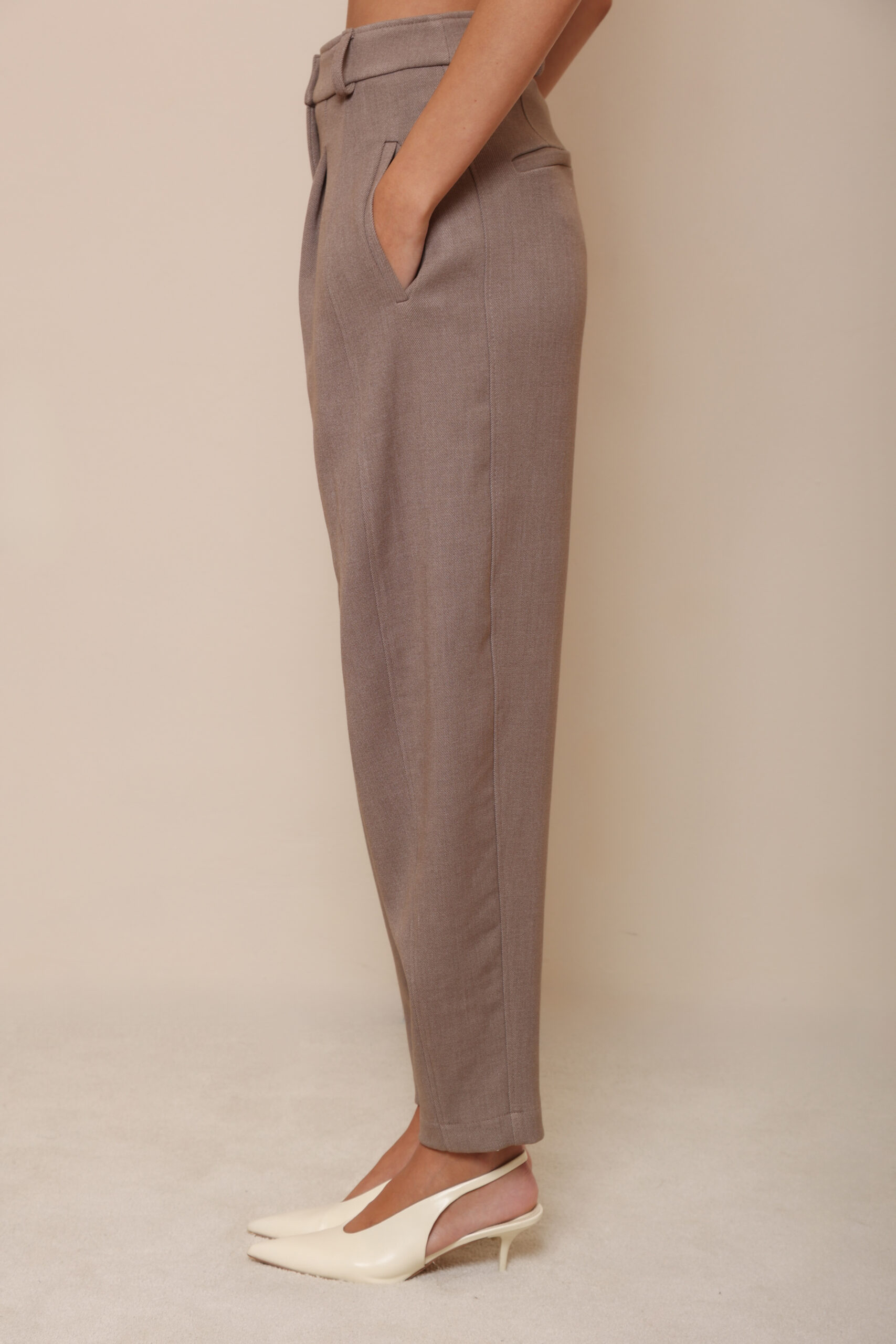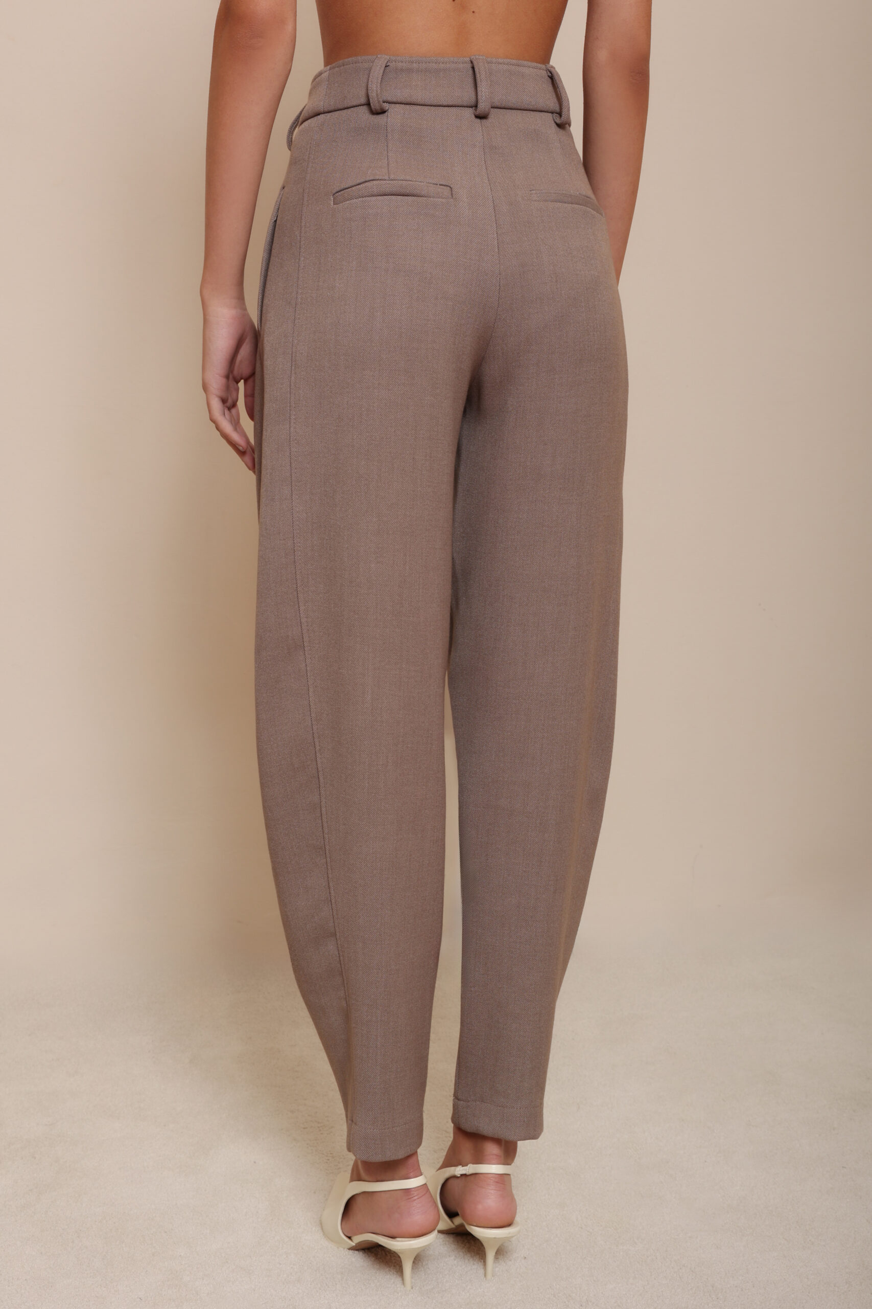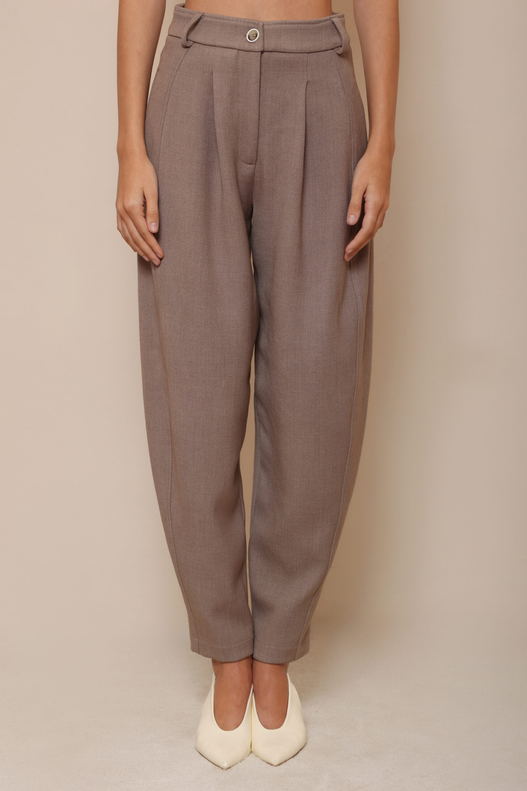 THESE TAILORED TROUSERS ARE CRAFTED FROM A PREMIUM WOOL FABRIC IN A TIMELESS TAUPE SHADE. DESIGNED WITH A HIGH WAIST AND SOFT STRUCTURED PLEATS THAT CREATE AN ELONGATED, RELAXED SILHOUETTE.